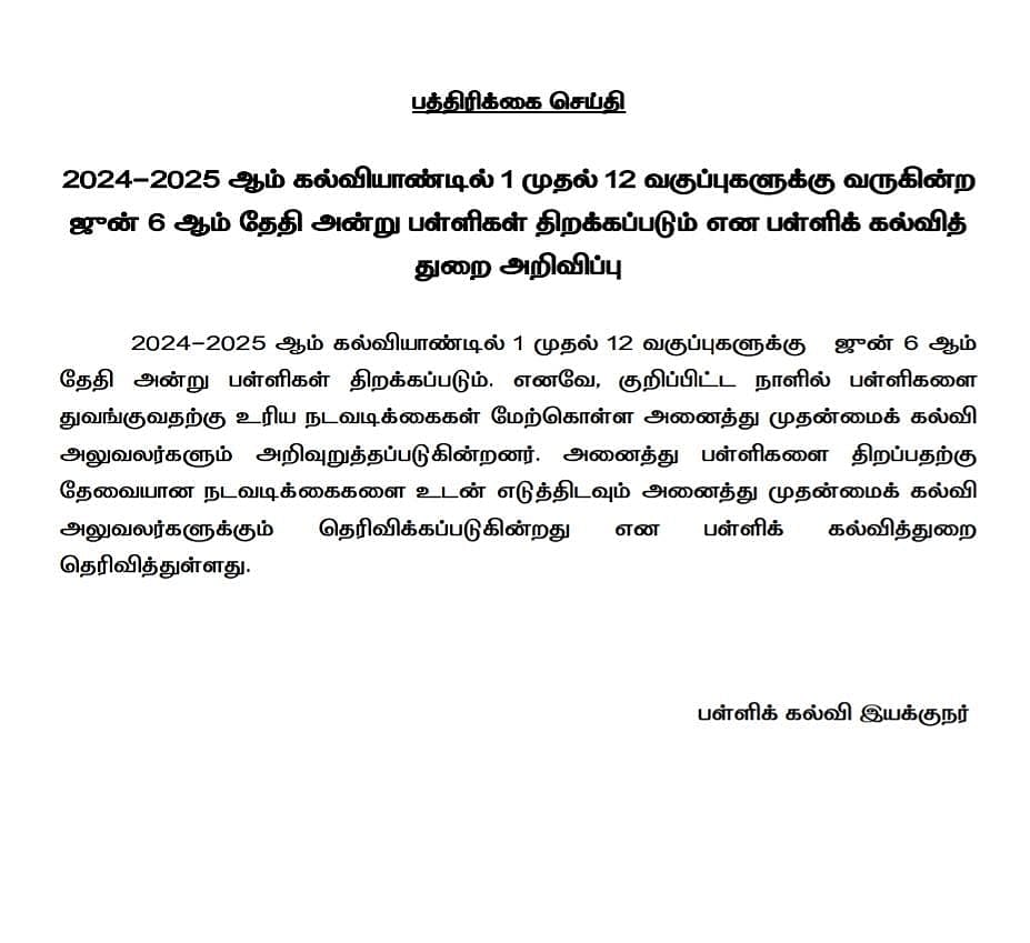 அறிக்கையின்படி, ஜூன் 6ஆம் தேதி அனைத்துப் பள்ளிகளையும் திறக்க தேவையான நடவடிக்கைகளை மேற்கொள்ளவும் மாவட்ட முதன்மைக் கல்வி அலுவலர்களுக்கு பள்ளிக் கல்வித் துறை சார்பில் அறிவுறுத்தப்பட்டுள்ளது.