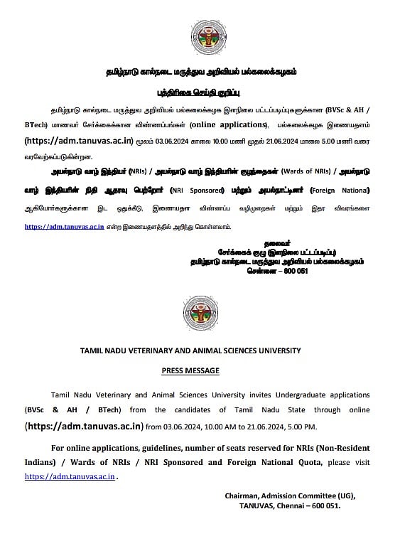 இந்த நிலையில், பி.வி.எஸ்சி. - ஏ.ஹெச். மற்றும் பி.டெக் படிப்புகளுக்கான நிகழாண்டு மாணவர் சேர்க்கைக்கு https://adm.tanuvas.ac.in என்ற இணையம் மூலம் ஜூன் 3 ஆம் முதல் ஜூன் 21 ஆம் தேதி மாலை 5.00 மணி வரை விண்ணப்பிக்கலாம் என்று தெரிவிக்கப்பட்டுள்ளது.