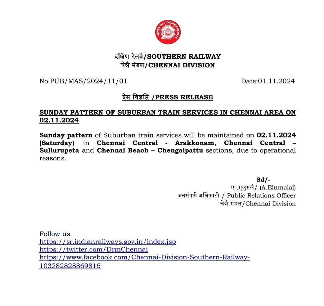 இந்த நிலையில், நாளை(அக். 2) சென்னை - அரக்கோணம், சென்னை - சூலூர்பேட்டை, சென்னை கடற்கரை - செங்கல்பட்டு இடையே இயக்கப்படும் மின்சார ரயில்கள் அனைத்தும் ஞாயிற்றுக் கிழமை அட்டவணைப்படி இயக்கப்படும் என்று தெரிவிக்கப்பட்டுள்ளது.