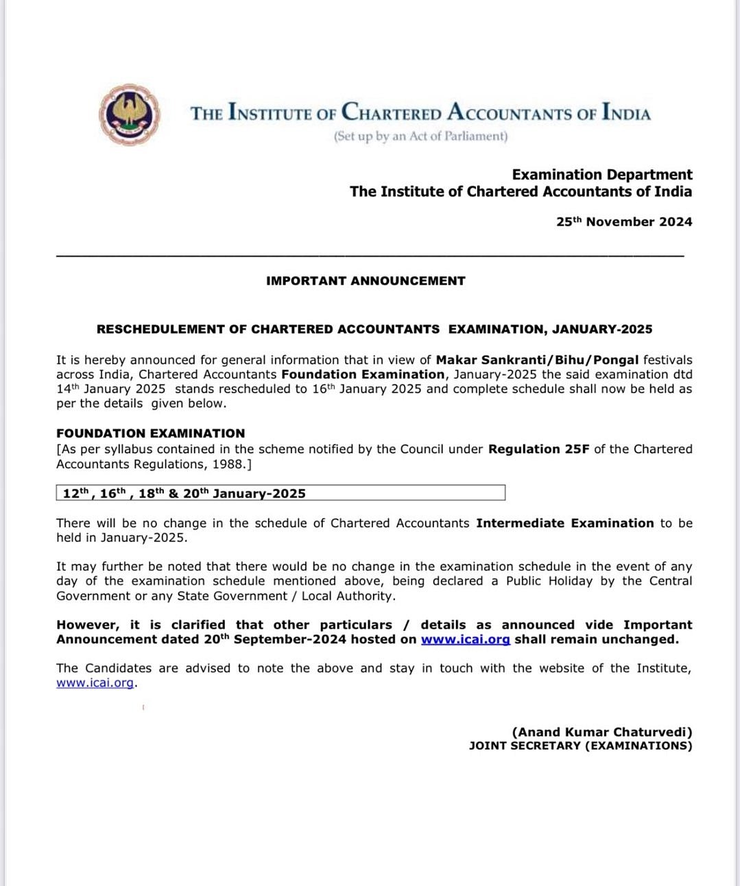 இந்த நிலையில், தேர்வு தேதிகளை மாற்றி இந்திய பட்டய கணக்காளர்கள் நிறுவனம் அறிவிப்பு வெளியிட்டுள்ளது.