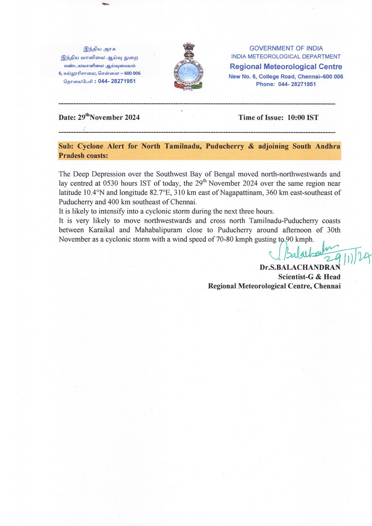 நாளை(நவ.30) பிற்பகலில் காரைக்கால் - மாமல்லபுரம் அருகே புயல் கரையைக் கடக்கும் என்றும், அப்போது 90 கி.மீ. வரை காற்று வீசக்கூடும் என்றும் தெரிவிக்கப்பட்டுள்ளது.