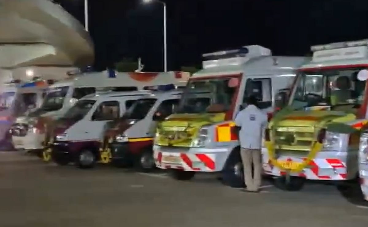 திருச்சி விமான நிலையத்தில் நிறுத்திவைக்கப்பட்டுள்ள ஆம்புலன்ஸ்கள்