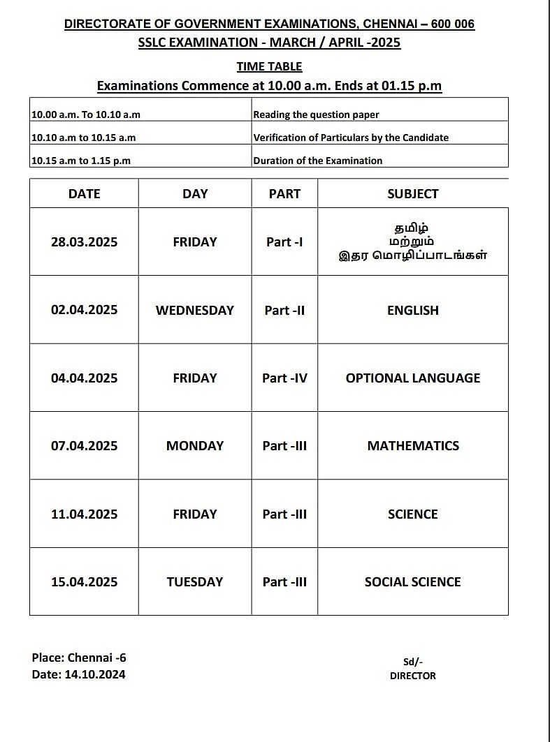 10ஆம் வகுப்பு பொதுத்தேர்வு மார்ச் 28ல் தொடங்கி ஏப்.15ஆம் தேதி வரை நடைபெறும். செய்முறைத் தேர்வு பிப்.22 தொடங்கி பிப்.28ஆம் தேதி வரை நடைபெறும்.