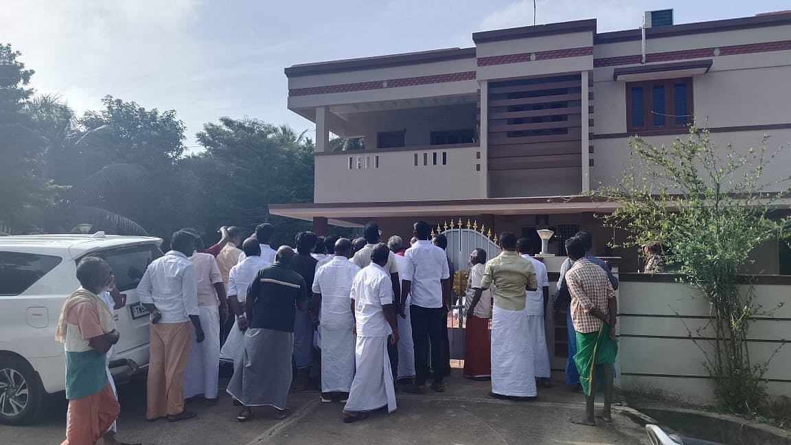 முன்னாள் அமைச்சர் வைத்தியலிங்கத்தின் வீட்டுக்கு வெளியே கூடியுள்ள அவரது ஆதரவாளர்கள்.