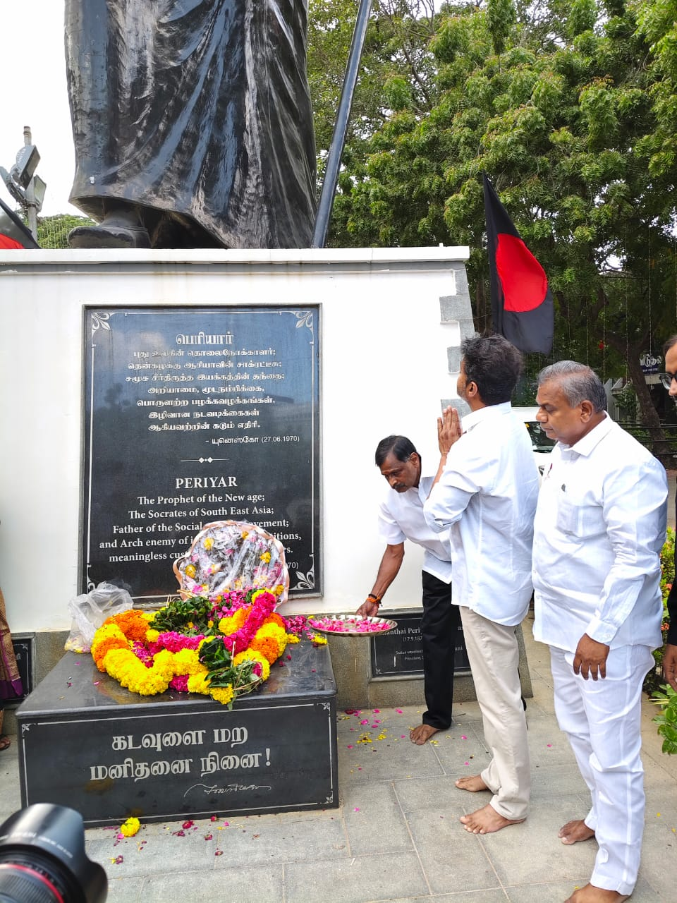 தமிழக வெற்றிக் கழகம்(தவெக) என்ற கட்சியைத் தொடங்கிய பிறகு, முதல்முறையாக அரசியல் நிகழ்வில் விஜய் கலந்து கொண்டுள்ளார். விஜய்யுடன் தவெக பொதுச் செயலர் புஸ்ஸி ஆனந்த் உள்ளிட்ட கட்சி நிர்வாகிகளும் பெரியார் படத்துக்கு மரியாதை செலுத்தினர். விஜய் செருப்பு அணியாமல் வெறுங்காலில் நடந்து சென்று பெரியார் சிலைக்கு மரியாதை செலுத்தியிருப்பது கவனத்தை ஈர்த்துள்ளது.