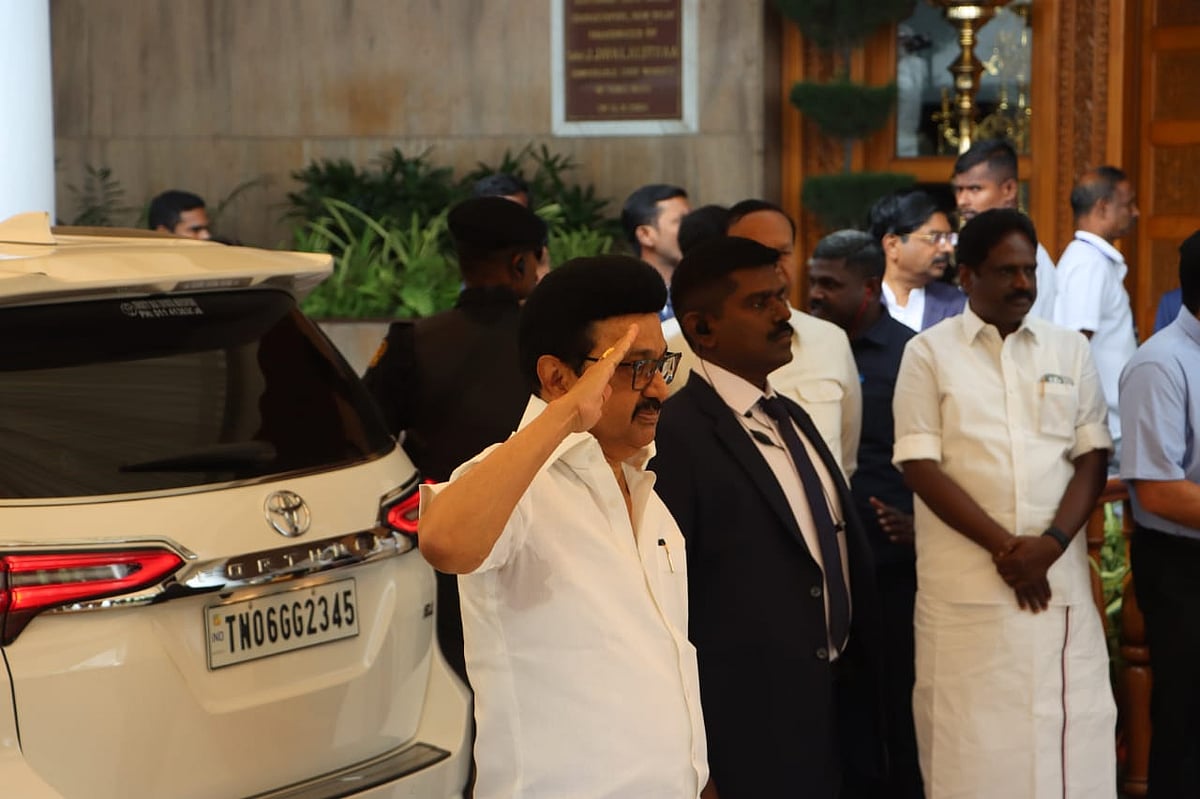தொடர்ந்து இன்று காலை பிரதமர் நரேந்திர மோடியை சந்திக்க புறப்பட்ட முதல்வர் மு.க.ஸ்டாலினுக்கு தமிழக காவல் படையினர் மரியாதை செலுத்தினர்.