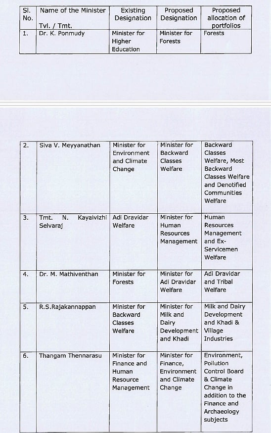 உயர்கல்வித் துறை அமைச்சர் பொன்முடி, மெய்யநாதன், கயல்விழி ஆகியோரின் துறைகள் மாற்றம் செய்யப்பட்டுள்ளன.