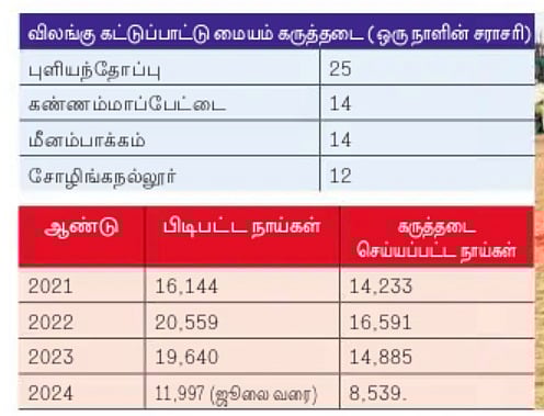 நிகழாண்டில் (ஜூலை வரை) 8,539 தெருநாய்களுக்கு கருத்தடை செய்யப்பட்டுள்ளதாக அதிகாரபூா்வ தகவல்கள் தெரிவிக்கின்றன. இவ்வாறு கருத்தடை செய்யப்படும் நாய்கள், சில நாள்களில் நோய்வாய்ப்பட்டு இறந்துவிடுவதாக பொதுமக்கள் குற்றஞ்சாட்டுகின்றனா்.