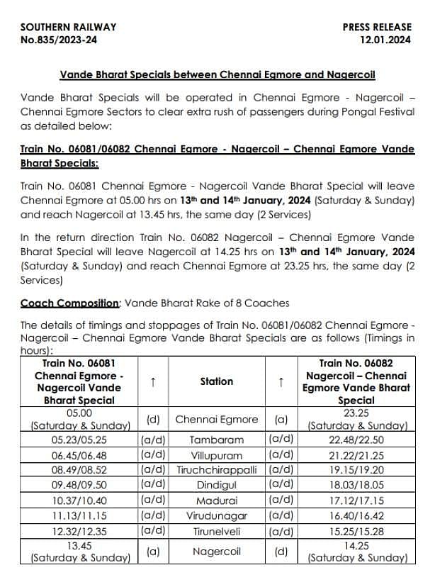 சென்னை எழும்பூா் - நாகர்கோவில் இடையே ஜன. 13 மற்றும் 14 ஆகிய தேதிகளில் இயக்கப்படும் சிறப்பு வந்தே பாரத் ரயில், எழும்பூரிலிருந்து காலை 5 மணிக்கு புறப்படும் இந்த ரயில் பிற்பகல் 1.45 மணிக்கு நாகா்கோவிலை சென்றடையும்.