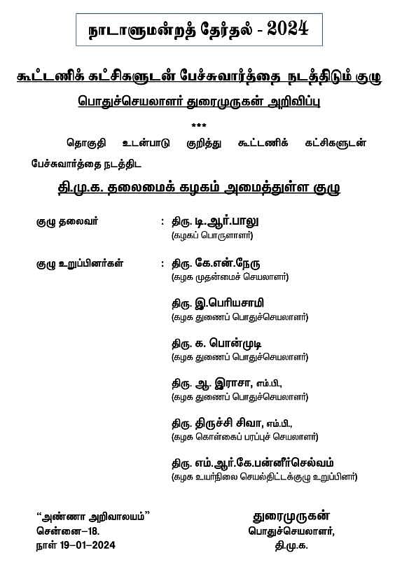 திமுக சார்பில் தொகுதி பங்கீடு, கூட்டணிக் கட்சிகளுடன் பேச்சுவார்த்தை நடத்துவதற்கு டி.ஆர். பாலு தலைமையில் குழு அமைக்கப்பட்டுள்ளது. இக்குழுவில் கே.என். நேரு, இ.பெரியசாமி, க.பொன்முடி, ஆ.ராசா, திருச்சி சிவா, எம்.ஆர்.கே.பன்னீர்செல்வம் உறுப்பினர்களாக இடம் பெற்றுள்ளனர்.