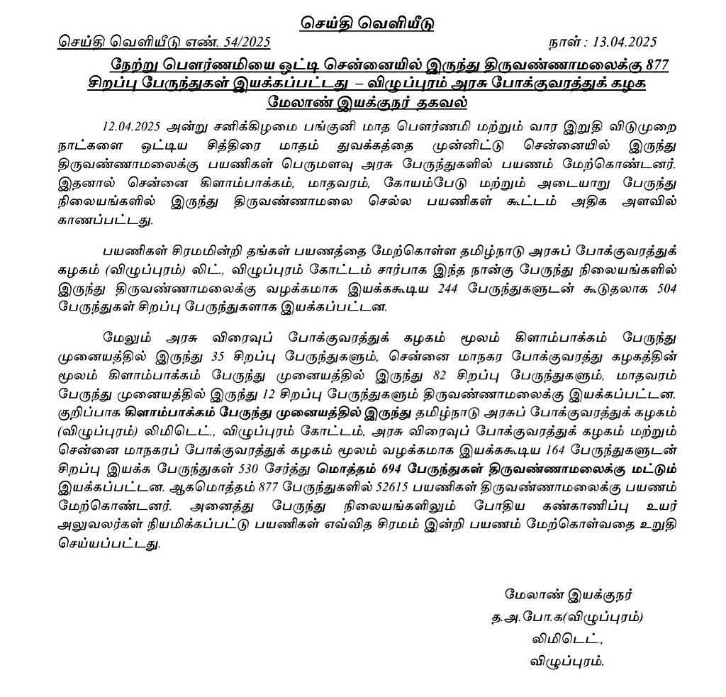 அதேசமயம் நேற்று (12.04.2025) பௌர்ணமியையொட்டி சென்னையில் இருந்து திருவண்ணாமலைக்கு 877 சிறப்பு பேருந்துகள் இயக்கப்பட்டது எனவும் தெரிவிக்கப்பட்டுள்ளது.