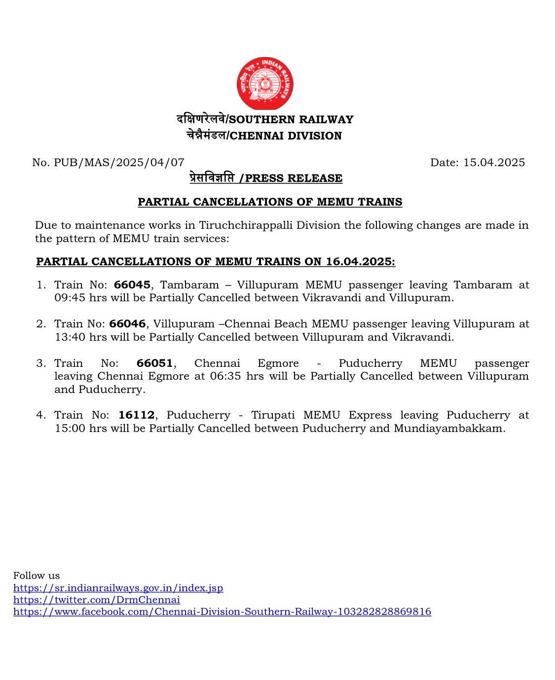பிற்பகல் 1.40 மணி விழுப்புரம் - சென்னை கடற்கரை பயணிகள் ரயில், விக்கிரவாண்டி - விழுப்புரம் இடையே பகுதியாக ரத்து செய்யப்படுகிறது.
