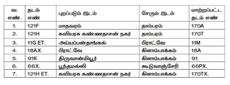 மேலும், ஒவ்வொரு பேருந்து வழித் தடத்திற்கும் ஒவ்வொரு தட எண் வழங்கப்பட்டுள்ளது. தற்போது உள்ள தட எண்களை பகுதி வாரியாக சீரமைத்து, 7 வழித்தட எண்களை மாறுதல் செய்து, அதே வழித்தடத்தில் நாளைமுதல் (மே 1) இயக்கப்படதாகக் கூறப்பட்டுள்ளது.
