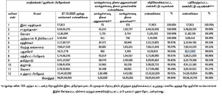 இதேபோல், புதுச்சேரியில் விநியோகிக்கப்பட்ட 10,20,815 (99.93) கணக்கீட்டு படிவங்களில் 10,11,921 (99.05%) படிவங்கள் பதிவேற்றம் செய்யப்பட்டுள்ளதாகவும் தோ்தல் ஆணையம் வெளியிட்ட செய்திக்குறிப்பில் தெரிவிக்கப்பட்டுள்ளது.