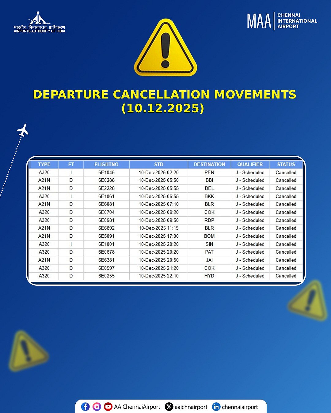 சென்னை விமான நிலையத்தில் இருந்து புறப்படும் 14 இண்டிகோ விமான சேவைகள் இன்று(டிச. 10) ரத்து செய்யப்பட்டுள்ளதாக விமான நிலைய நிர்வாகம் அறிவித்துள்ளது.