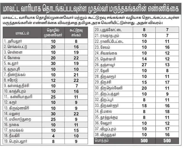 மாவட்ட வாரியாக தொழில்முனைவோா் மற்றும் கூட்டுறவு சங்கங்கள் வழியாக தொடங்கப்படவுள்ள மருந்தகங்களின் எண்ணிக்கை விவரத்தை தமிழக அரசு வெளியிட்டுள்ளது. அதன் விவரம்: