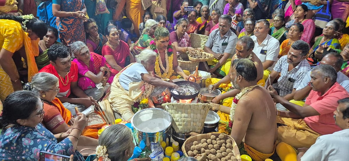 நெய்யால் பக்தர்களுக்கு நெற்றியில் திலகமிட்டு மூதாட்டி ஆசி வழங்கினார். மகா சிவராத்திரியை முன்னிட்டு 48 நாள்கள் விரதமிருந்த முத்தம்மாள், அம்மனுக்கு சாற்றிய புடவையை அணிந்து, கொதிக்கும் நெய்யில் கையால் அப்பம் செய்தார்.