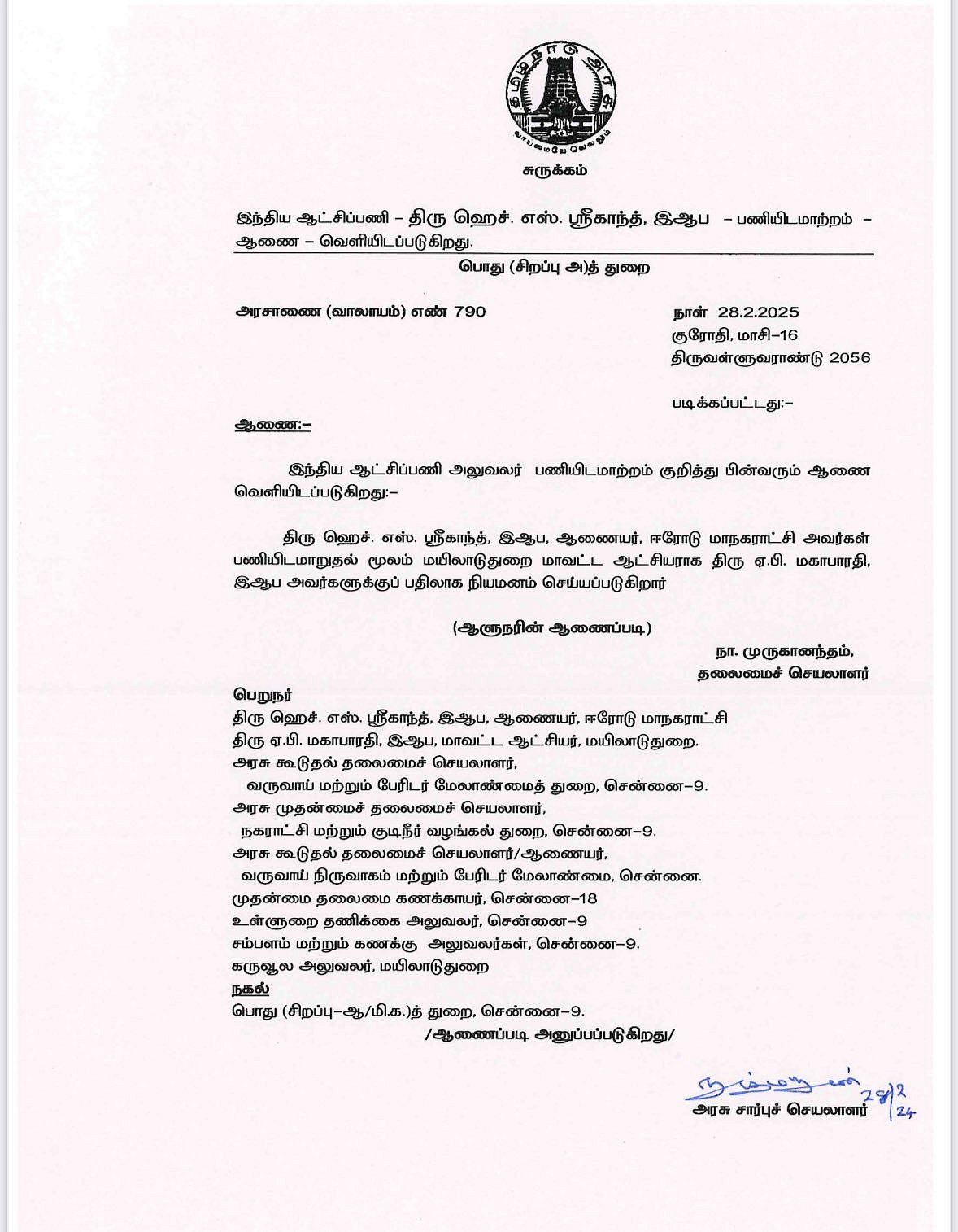 இதையடுத்து ஈரோடு மாநகராட்சி ஆணையராக இருந்த ஸ்ரீகாந்த் மயிலாடுதுறை ஆட்சியராக நியமிக்கப்பட்டுள்ளார்.