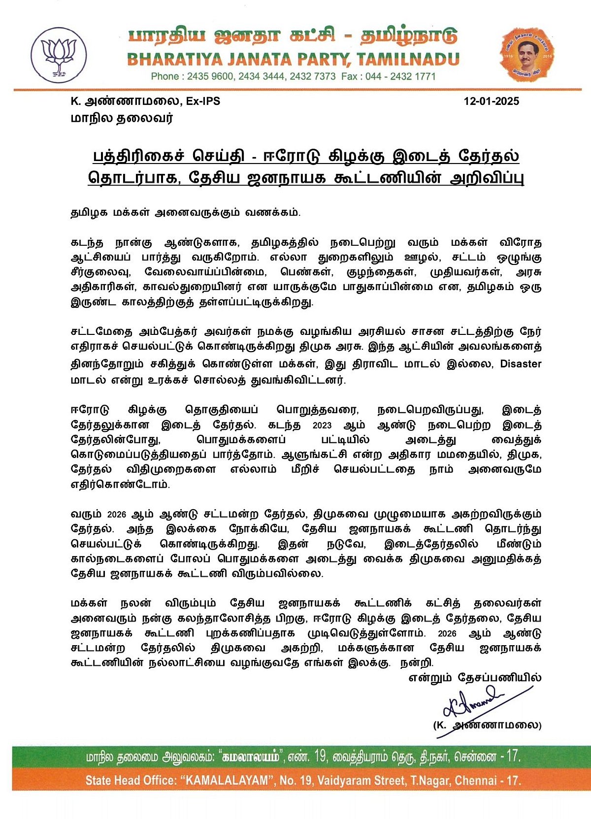 மக்கள் நலன் விரும்பும் தேசிய ஜனநாயகக் கூட்டணிக் கட்சித் தலைவர்கள் அனைவரும் நன்கு கலந்தாலோசித்த பிறகு, ஈரோடு கிழக்கு இடைத் தேர்தலை, தேசிய ஜனநாயகக் கூட்டணி புறக்கணிப்பதாக முடிவெடுத்துள்ளோம். 2026 ஆம் ஆண்டு சட்டமன்ற தேர்தலில் திமுகவை அகற்றி, மக்களுக்கான தேசிய ஜனநாயகக் கூட்டணியின் நல்லாட்சியை வழங்குவதே எங்கள் இலக்கு. நன்றி. இவ்வாறு அதில் குறிப்பிடப்பட்டுள்ளது.