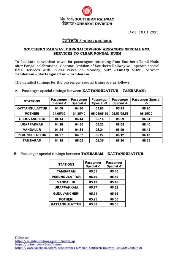 இந்த சிறப்பு ரயில் சேவை வரும் 20ஆம் தேதி தாம்பரம்-காட்டாங்குளத்தூர் இடையே இயக்கப்படும் என்றும் அதுவும் 12 பெட்டிகளுடன் சிறப்பு ரயில்கள் இயக்கப்படும் என்றும் தெற்கு ரயில்வே வெளியிட்டுள்ள செய்திக்குறிப்பில் குறிப்பிடப்பட்டுள்ளது.