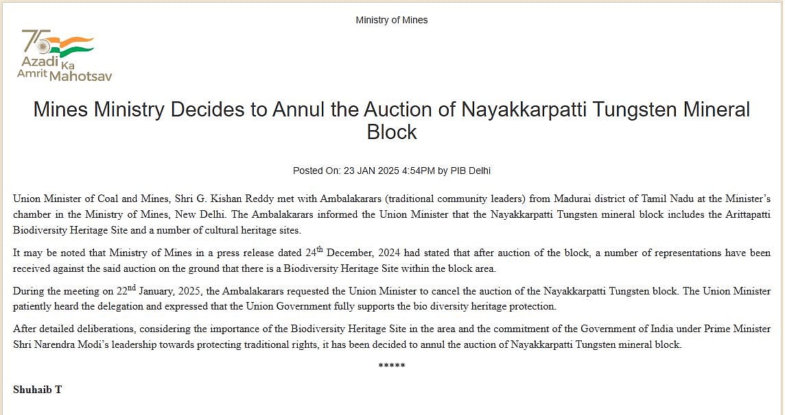 அரிட்டாபட்டியில் டங்ஸ்டன் சுரங்கம் அமைப்பதற்கான ஏலத்தை நிரந்தரமாக ரத்து செய்தது மத்திய அரசு.