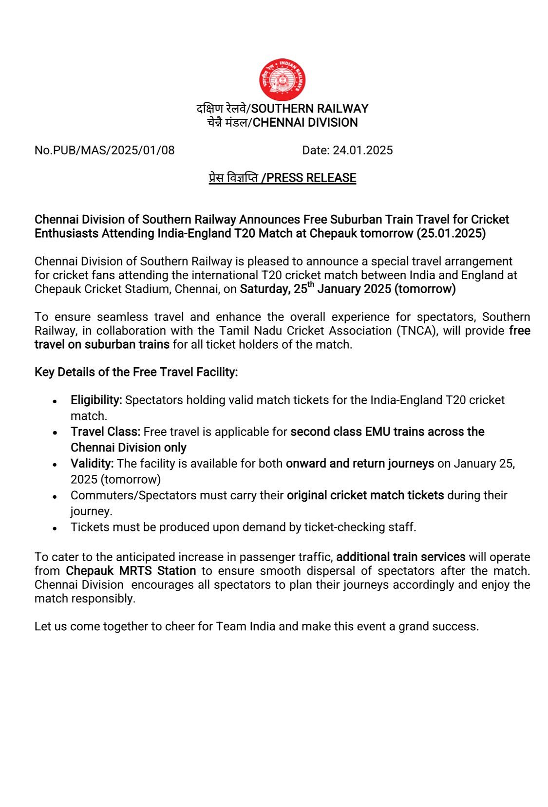 இந்த நிலையில் டி20 கிரிக்கெட் போட்டிக்கு செல்வோர் நாளை மின்சார ரயில்களில் இலவசமாக பயணிக்கலாம் என தெற்கு ரயில்வே அறிவித்துள்ளது.