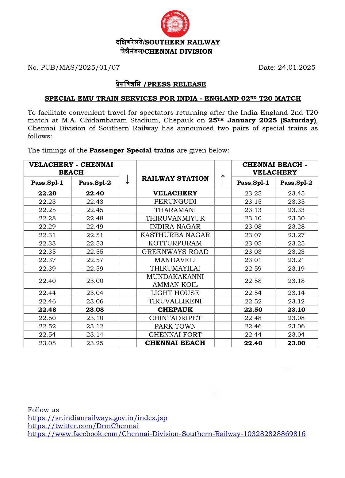 இதனிடையே மற்றொரு அறிக்கையில், கிரிக்கெட் போட்டியை பாா்த்துவிட்டு வீடு திரும்புவோருக்கு வசதிக்காக 2 சிறப்பு ரயில்களும் இயக்கப்படும் எனவும் தெரிவிக்கப்பட்டுள்ளது.