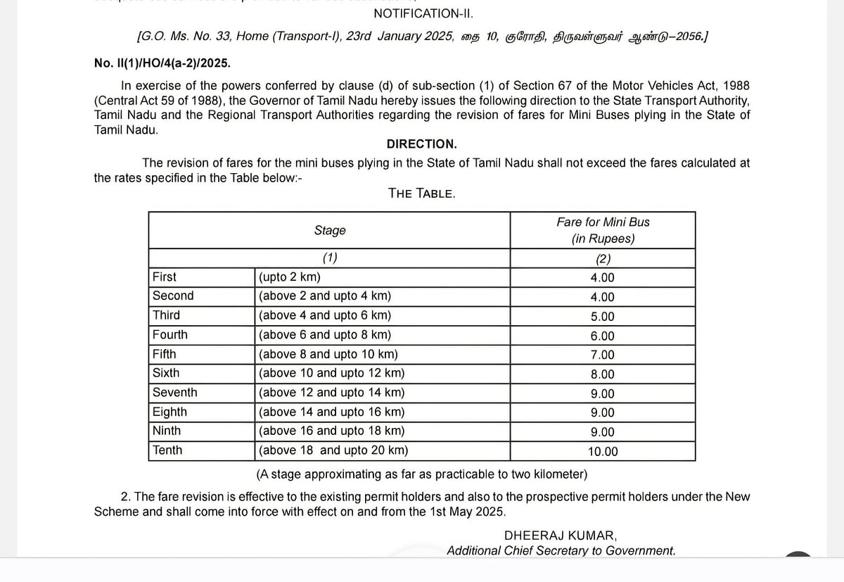 தமிழ்நாடு முழுவதும் மினி பேருந்துகளுக்கான பயண கட்டணம் மாற்றியமைக்கப்பட்டுள்ளது. மேலும், சென்னையின் சில பகுதிகளுக்கு மினி பேருந்து சேவையை விரிவாக்க உள்துறை பரிந்துரைத்துள்ளது. இதுதொடா்பாக உள்துறை கூடுதல் தலைமைச் செயலா் தீரஜ்குமாா் வெளியிட்ட உத்தரவு அரசிதழில் வெளியிடப்பட்டுள்ளது. உத்தரவு விவரம்: