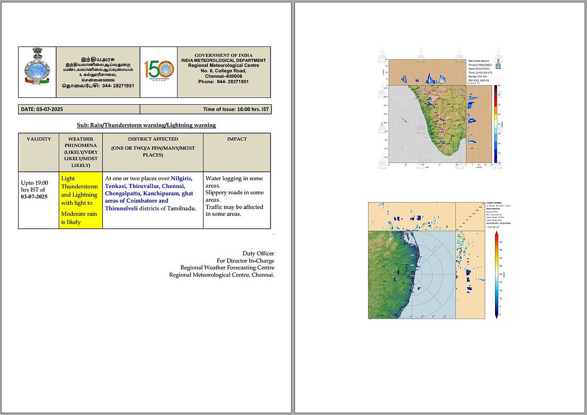 இந்த நிலையில், அடுத்த 3 மணி நேரத்துக்கு (இரவு 7 மணி வரை) நீலகிரி, தென்காசி, திருவள்ளூர், சென்னை, செங்கல்பட்டு, காஞ்சிபுரம் மற்றும் கோயம்புத்தூர், திருநெல்வேலி மாவட்டத்தின் மலைப் பகுதிகளில் இடி, மின்னலுடன் கூடிய லேசானது முதல் மிதமான மழை பெய்யக்கூடும் என்று சென்னை வானிலை ஆய்வு மையம் வெளியிட்ட அறிக்கையில் தெரிவிக்கப்பட்டுள்ளது.