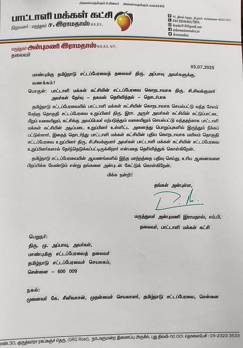பாமகவின் புதிய கொறடாவாக மயிலம் சிவக்குமாரை நியமிக்க விடும் என்ற பாமக குழு, பேரவைத் தலைவர் அப்பாவுவைச் சந்தித்து மனு அளித்துள்ளது.
