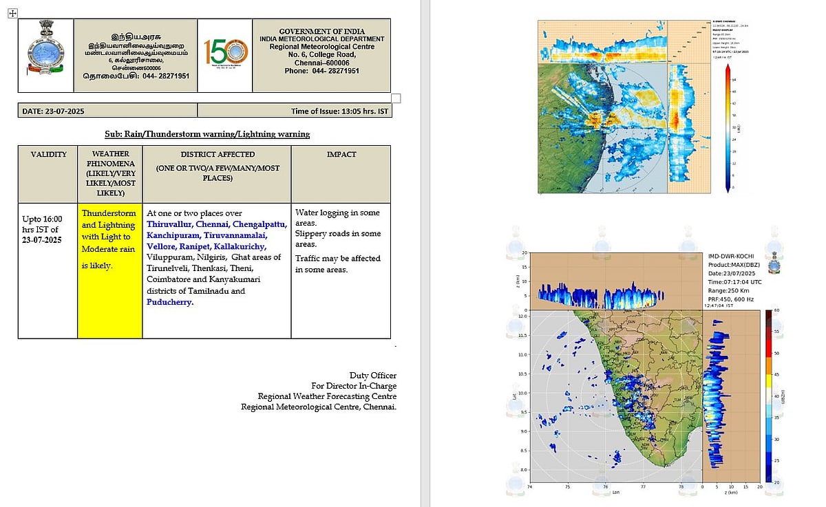 தென்னிந்திய கடலோர பகுதிகளில் வளிமண்டல மேலடுக்கு சுழற்சி நிலவுவதால், தமிழகத்தின் ஒருசில இடங்களிலும், புதுச்சேரி, காரைக்கால் பகுதிகளிலும் புதன்கிழமை (ஜூலை 23) இடி, மின்னலுடன் கூடிய லேசானது முதல் மிதமான மழைக்கு வாய்ப்புள்ளதாகத் தெரிவிக்கப்பட்டுள்ளது.