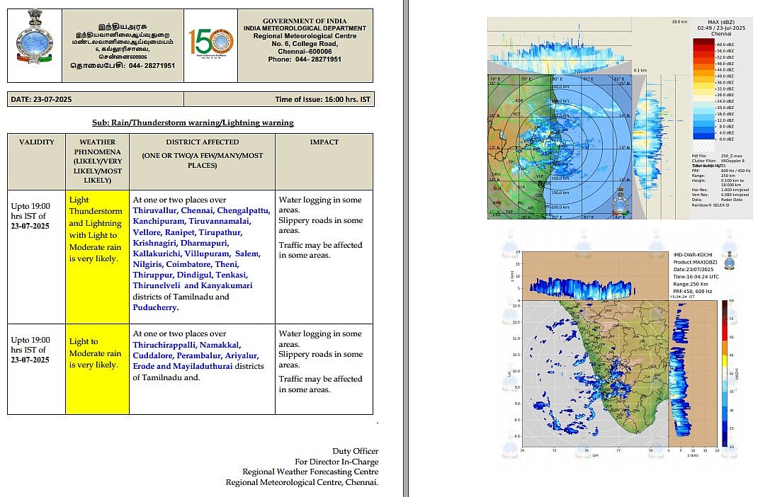 தென்னிந்திய கடலோர பகுதிகளில் வளிமண்டல மேலடுக்கு சுழற்சி நிலவுவதால், தமிழகத்தின் ஒருசில இடங்களிலும், புதுச்சேரி, காரைக்கால் பகுதிகளிலும் புதன்கிழமை (ஜூலை 23) இடி, மின்னலுடன் கூடிய லேசானது முதல் மிதமான மழைக்கு வாய்ப்புள்ளதாகவும் 50 கி.மீ. வேகத்தில் தரைக்காற்று வீசக்கூடும் என்றும் தெரிவிக்கப்பட்டுள்ளது.
