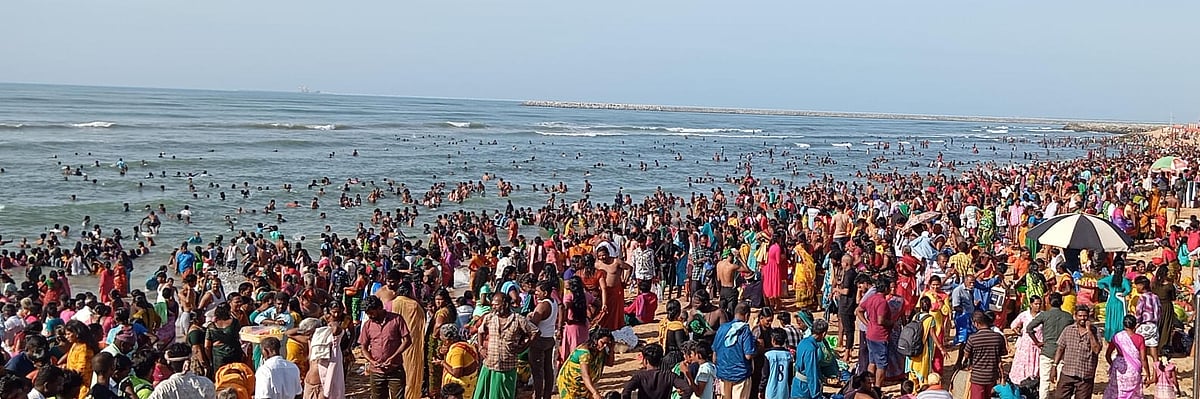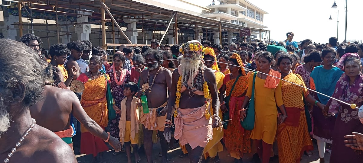 பக்தர்கள் காவடி, அலகு குத்தியும், பால்குடம் எடுத்து வழிபட்டனர். கூட்டம் நெரிசல் காரணமாக திருக்கோயில் வளாகம், கடற்கரை உள்ளிட்ட இடங்களிலே பக்தர்கள் தாங்களே தேங்காய் உடைத்து பூஜை செய்து வருகின்றனர்.