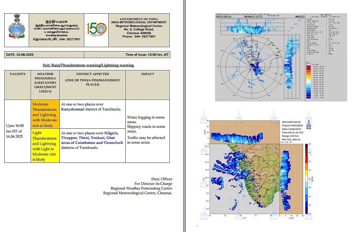 நீலகிரி, திருப்பூர், தேனி, தென்காசி, கோயம்புத்தூர் மற்றும் திருநெல்வேலி மாவட்டங்களின் மேற்குத்தொடர்ச்சி மலைப் பகுதிகளில் ஓரிரு இடங்களில் இடி, மின்னலுடன் கூடிய லேசானது முதல் மிதமான மழை பெய்ய வாய்ப்புள்ளதாகவும் தெரிவிக்கப்பட்டுள்ளது.