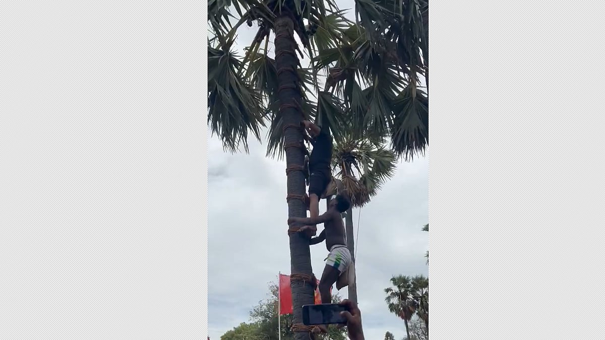 அப்போது கள் இறக்க தேவையான பொருட்களுடன் பனை மரத்தில் சீமான் ஏறினார். சீமான் மரம் ஏறுவதற்கு வசதியாக பனை மரத்தில் ஏணிபோல் கட்டைகளை வைத்து கட்டியிருந்தனர்.