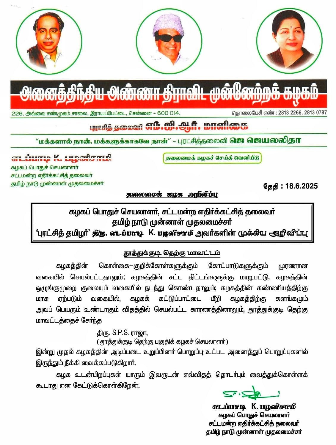 "கழகத்தின் கொள்கை-குறிக்கோள்களுக்கும் கோட்பாடுகளுக்கும் முரணான வகையில் செயல்பட்டதாலும் கழகத்தின் சட்ட திட்டங்களுக்கு மாறுபட்டு, கழகத்தின் ஒழுங்குமுறை குலையும் வகையில் நடந்து கொண்டதாலும் கழகத்தின் கண்ணியத்திற்கு மாசு ஏற்படும் வகையில் கழகக் கட்டுப்பாட்டை மீறி கழகத்திற்கு களங்கமும் அவப் பெயரும் உண்டாகும் விதத்தில் செயல்பட்ட காரணத்தினாலும் தூத்துக்குடி தெற்கு மாவட்டத்தைச் சேர்ந்த எஸ்.பி.எஸ். ராஜா(தூத்துக்குடி தெற்கு பகுதி செயலாளர் ) இன்று(புதன்கிழமை) முதல் கழகத்தின் அடிப்படை உறுப்பினர் பொறுப்பு உள்பட அனைத்துப் பொறுப்புகளில் இருந்தும் நீக்கி வைக்கப்படுகிறார். கழக உடன்பிறப்புகள் யாரும் இவருடன் எவ்விதத் தொடர்பும் வைத்துக்கொள்ளக்கூடாது என கேட்டுக்கொள்கிறேன்" என்று கூறப்பட்டுள்ளது.
