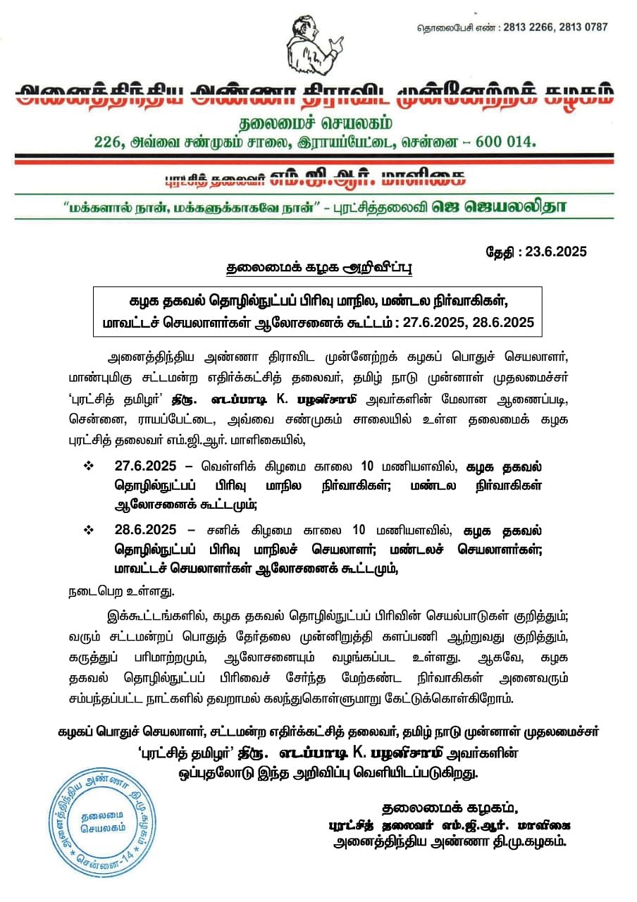 அதிமுக பொதுச் செயலாளர், எதிர்க்கட்சித் தலைவர் எடப்பாடி கே பழனிசாமியின் ஆணைப்படி சென்னை ராயப்பேட்டை அவ்வை சண்முகம் சாலையில் உள்ள எம்.ஜி.ஆர். மாளிகையில் 27.6.2025 வெள்ளிக்கிழமை காலை 10 மணியளவில் தகவல் தொழில்நுட்பப் பிரிவு மாநில நிர்வாகிகள், மண்டல நிர்வாகிகள் ஆலோசனைக் கூட்டமும்