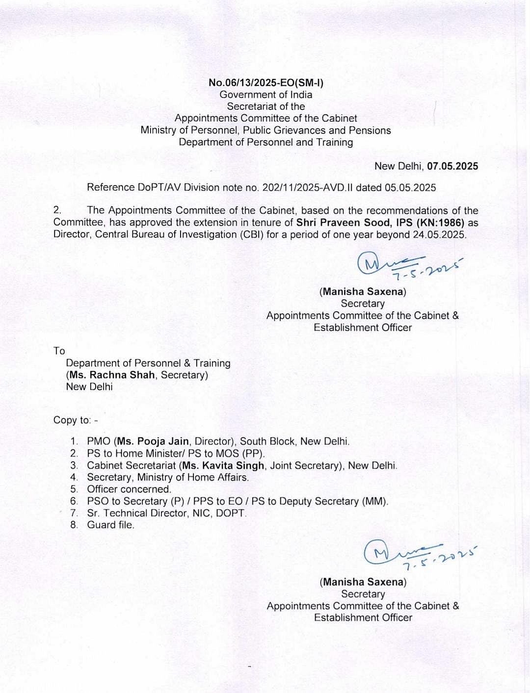 பிரதமர், மக்களவை எதிர்க்கட்சித் தலைவர் மற்றும் உச்ச நீதிமன்ற தலைமை நீதிபதி ஆகிய மூன்று பேர் அடங்கிய குழு அளிக்கும் பரிந்துரையின் அடிப்படையில் பிரவீண் சூட்டின் பதவிக்காலம் நீட்டித்து மத்திய அரசு உத்தரவிட்டுள்ளது.