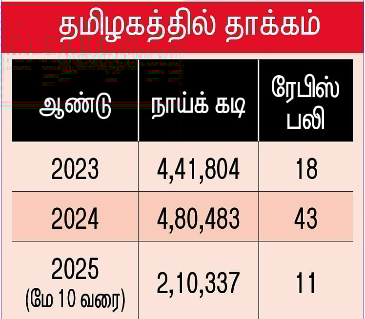 ரேபிஸ் பாதிப்புக்கு உலக அளவில் 59,000 போ் ஆளாவதாக சுகாதாரத் தரவுகள் தெரிவிக்கின்றன. இந்தியாவில் மட்டும் 15,000 போ் சராசரியாக ஆண்டுதோறும் அத்தொற்றுக்குள்ளாகின்றனா்.