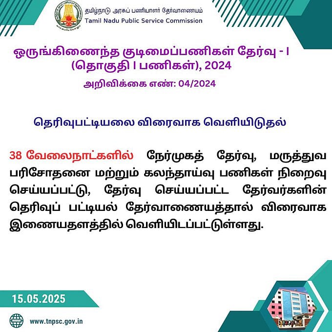 இந்த நிலையில், குரூப் 1 தேர்வு முடிவுகள் வெளியிடப்பட்டு, இறுதிப் பட்டியலை தமிழ்நாடு அரசுப் பணியாளர் தேர்வாணையம்(டிஎன்பிஎஸ்சி) வெளியிட்டுள்ளது.