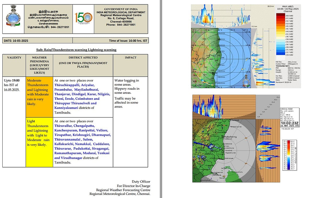 திருச்சிராப்பள்ளி, அரியலூர், பெரம்பலூர், மயிலாடுதுறை, தஞ்சாவூர், திண்டுக்கல், கரூர், நீலகிரி, தேனி, ஈரோடு, கோவை, திருப்பூர், திருநெல்வேலி மற்றும் கன்னியாகுமரி மாவட்டங்களில் இடி, மின்னலுடன் கூடிய மிதமான மழை பெய்ய வாய்ப்பு உள்ளது.