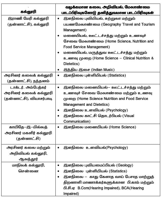 மேலும், சென்னை மண்டலத்தில் உள்ள கீழ்க்கண்ட அரசு கலை மற்றும் அறிவியல் கல்லூரிகளில் மாணவர்களின் தேவைக்கேற்பவும், வேலைவாய்ப்பு பெற்றுத்தரும் தனித்துவமான பாடப்பிரிவுகள் நடத்தப்பட்டு வருகின்றன. இவ்வாறு உயர்கல்வித்துறை அமைச்சர் கோவி. செழியன் தெரிவித்தார்.