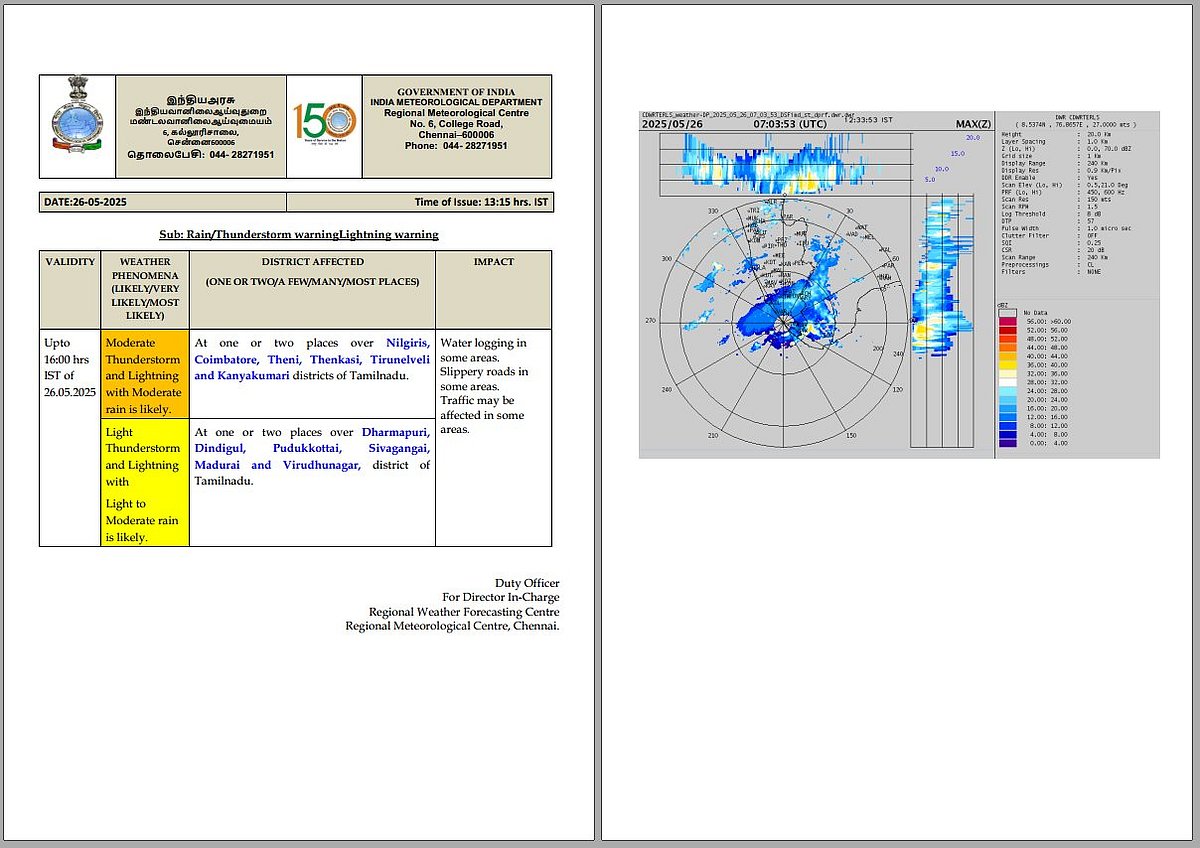 இன்று (திங்கள்கிழமை) அடுத்த 3 மணி நேரத்துக்கு அதாவது மாலை 4 மணி வரை தமிழ்நாட்டின் நீலகிரி, கோயம்புத்தூர், தேனி, தென்காசி, திருநெல்வேலி, கன்னியாகுமரி மாவட்டங்களில் ஓரிரு இடங்களில் இடி, மின்னலுடன் கூடிய மிதமான மழை பெய்ய வாய்ப்புள்ளதாகவும்