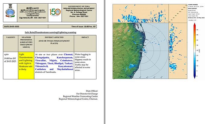 இதன்காரணமாக, இன்று(மே 28) தமிழகத்தில் ஓரிரு இடங்களிலும், புதுவை மற்றும் காரைக்கால் பகுதிகளிலும் லேசானது முதல் மிதமான மழை பெய்யக்கூடும் என்று சென்னை வானிலை ஆய்வு மையம் தெரிவித்துள்ளது.