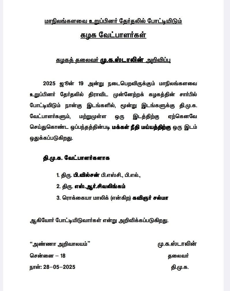 மாநிலங்களவைத் தேர்தலில் திமுக சார்பில் போட்டியிடும் வேட்பாளர்கள் பெயர்களை கட்சித் தலைமை வெளியிட்டுள்ளது. அதன்படி, நடிகரும் மநீம தலைவருமான கமல்ஹாசன், தற்போது மாநிலங்களவை உறுப்பினராக உள்ள வழக்குரைஞர் பி. வில்சன், கவிஞர் சல்மா,சேலம் கிழக்கு மாவட்ட திமுக செயலாளராக உள்ள எஸ்.ஆர். சிவலிங்கம் ஆகியோர் வேட்பாளராக அறிவிக்கப்பட்டுள்ளனர்.