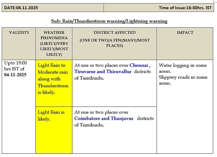 இந்நிலையில் அடுத்த 3 மணி நேரத்துக்கு(இரவு 7 மணி வரை) சென்னை, திருவள்ளூர், திருவாரூர் மாவட்டங்களில் ஓரிரு இடங்களில் லேசானது முதல் மிதமான மழை பெய்ய வாய்ப்புள்ளது.