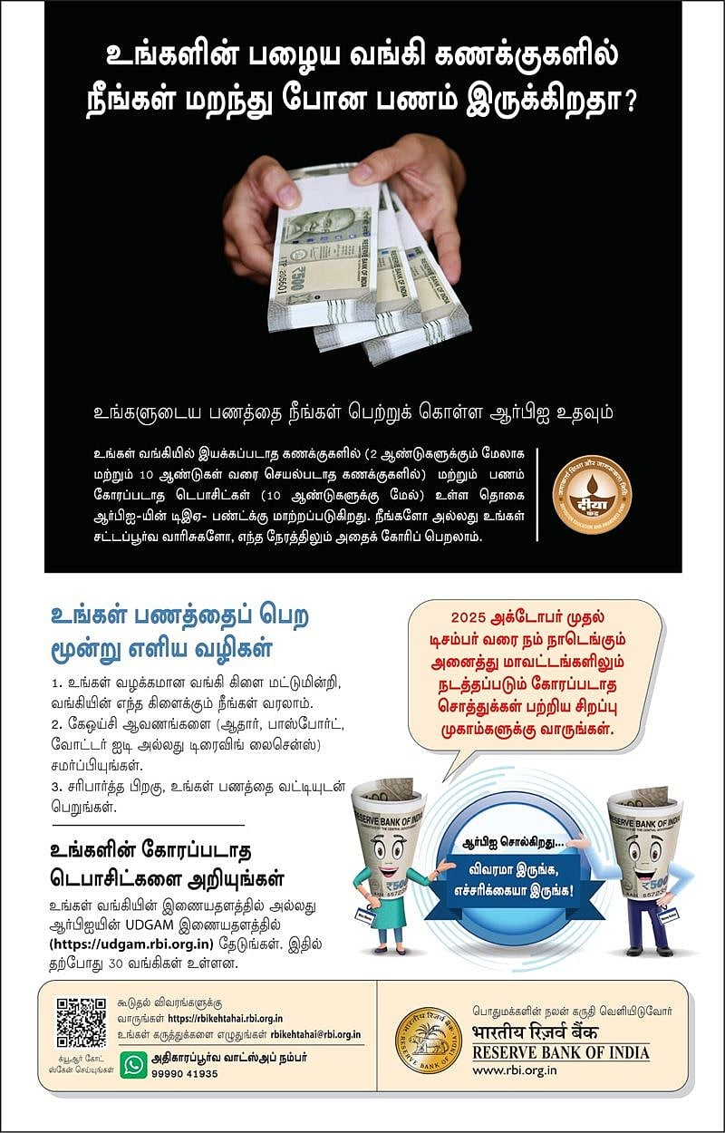 2025 அக்டோபர் முதல் டிசம்பர் வரை நாடெங்கும் அனைத்து மாவட்டங்களிலும் நடத்தப்படும் சிறப்பு முகாம்கள் மூலமாக உரிமை கோரப்படாத வங்கியில் உள்ள பணத்தை உரிய ஆவணங்களை வழங்கிப் பெறலாம் என்று ஆர்பிஐ கூறியுள்ளது.