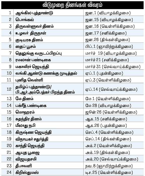 தமிழகத்தில் வருகிற 2026-ஆம் ஆண்டுக்கு பொது விடுமுறை தினங்களாக 24 நாள்கள் அறிவிக்கப்பட்டுள்ளது. இதற்கான உத்தரவை தமிழக அரசின் தலைமைச் செயலர் நா.முருகானந்தம் பிறப்பித்துள்ளார்.