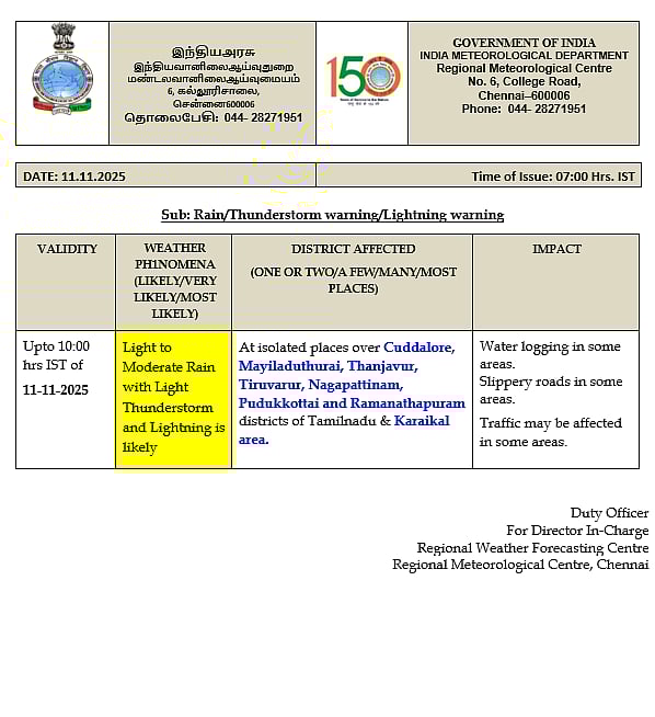 வட உள் தமிழகம், அதையொட்டிய பகுதிகளின் மேல் ஒரு வளிமண்டல கீழடுக்கு சுழற்சி நிலவுவதால், செவ்வாய்க்கிழமை (நவ.11) தமிழகத்தில் ஒருசில இடங்களிலும், புதுச்சேரி, காரைக்கால் பகுதிகளிலும் இடி, மின்னலுடன் கூடிய மிதமான மழைக்கு வாய்ப்புள்ளது.