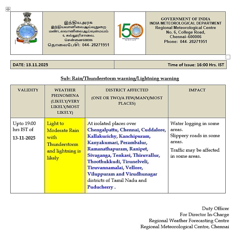 இதன் காரணமாக, இன்று(நவ. 13) தமிழகத்தில் ஓரிரு இடங்களிலும், புதுவை மற்றும் காரைக்கால் பகுதிகளிலும், இடி, மின்னலுடன் கூடிய லேசானது முதல் மிதமான மழை பெய்யக்கூடும்.